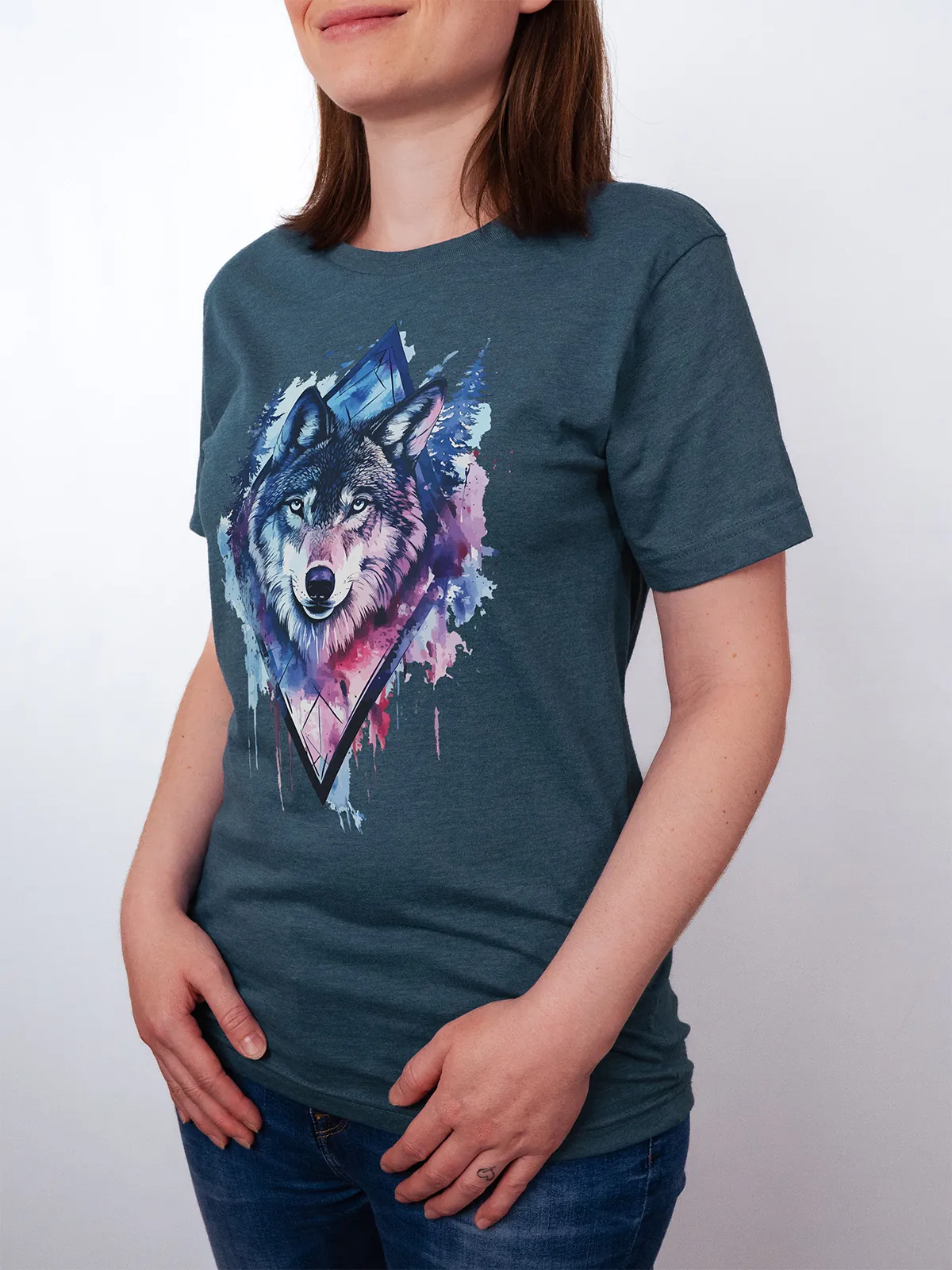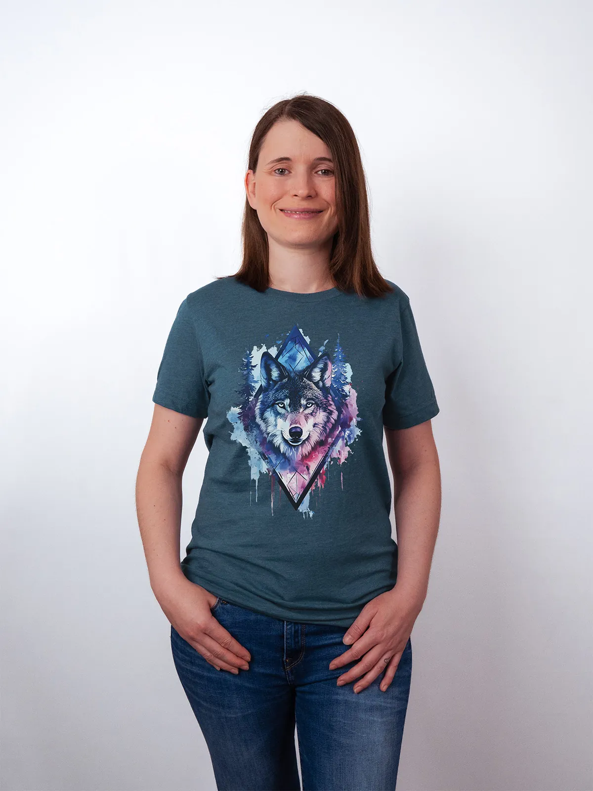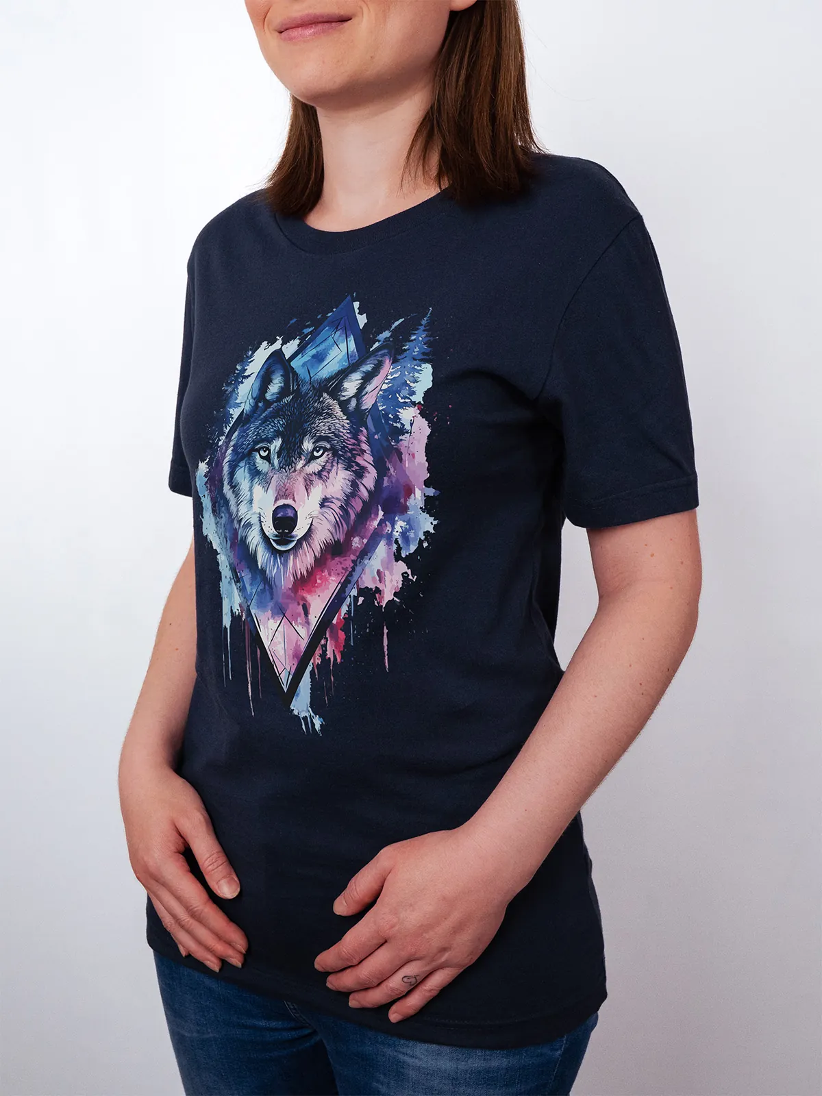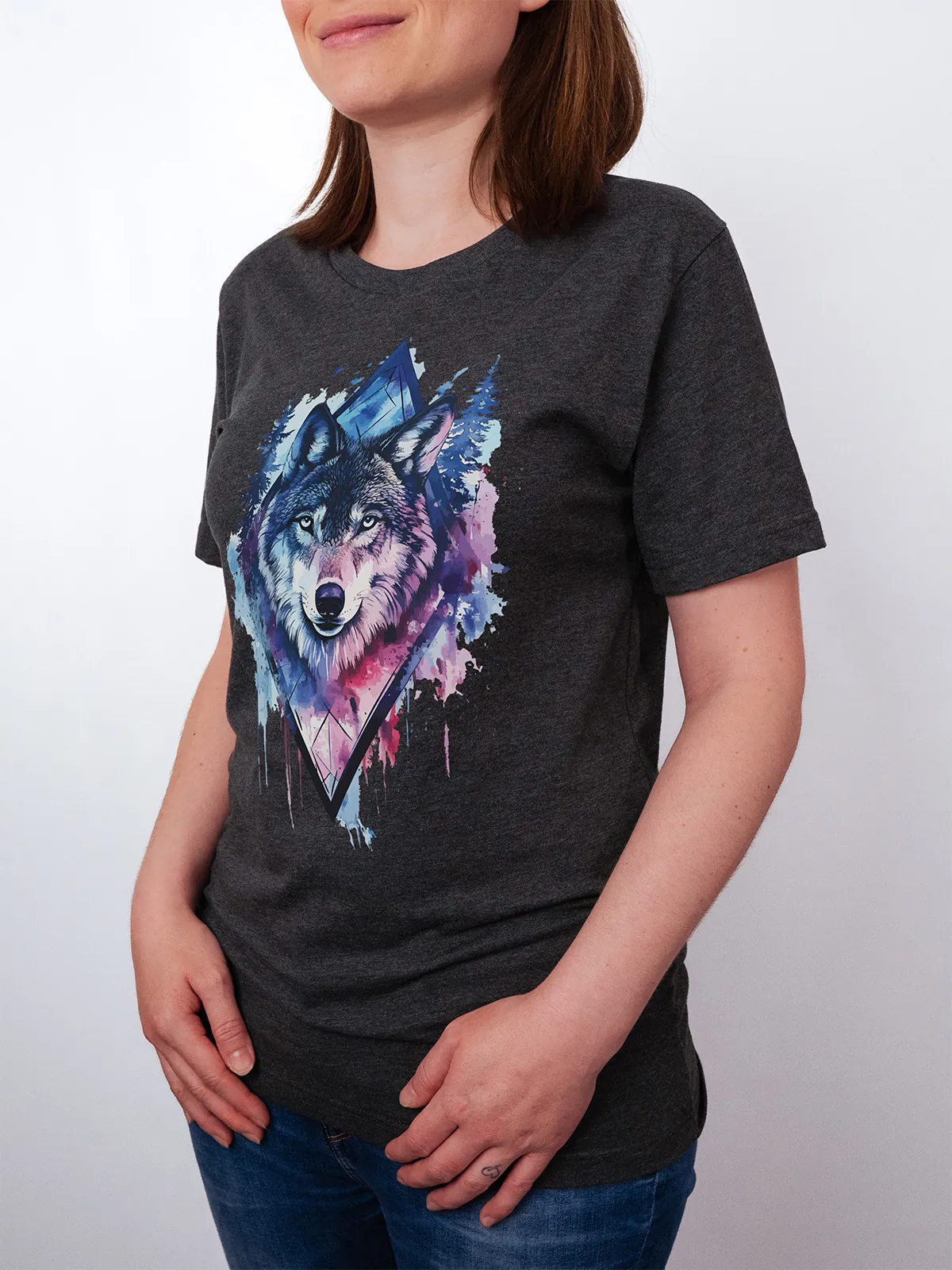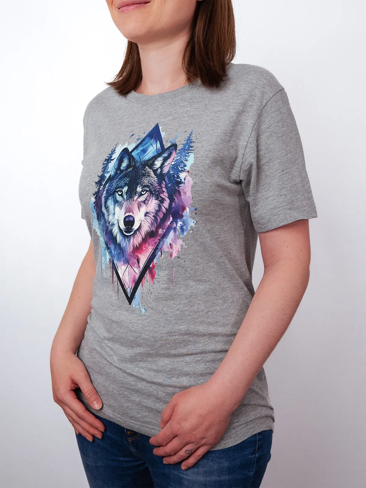Umfassen Sie Ihre wilde innere Kraft mit einem Design, das einen majestätischen Wolf in leuchtenden Wasserfarben aus Blau und Magenta zeigt, umrahmt von heiliger Geometrie und Waldlandschaft. Dieses T-Shirt zelebriert die spirituelle Verbindung und die rohe Kraft des Wolfsgeistes und ist perfekt für alle, die sich von der Symbolik der Tiere inspirieren lassen und Mut und Intuition verkörpern möchten. Egal, ob Sie spirituell auf der Suche sind oder sich zu lebendigen Ausdrucksformen der Symbolik der Tierwelt hingezogen fühlen, dieses Design bringt transformative Energie und ungezähmte Authentizität in Ihre Garderobe.