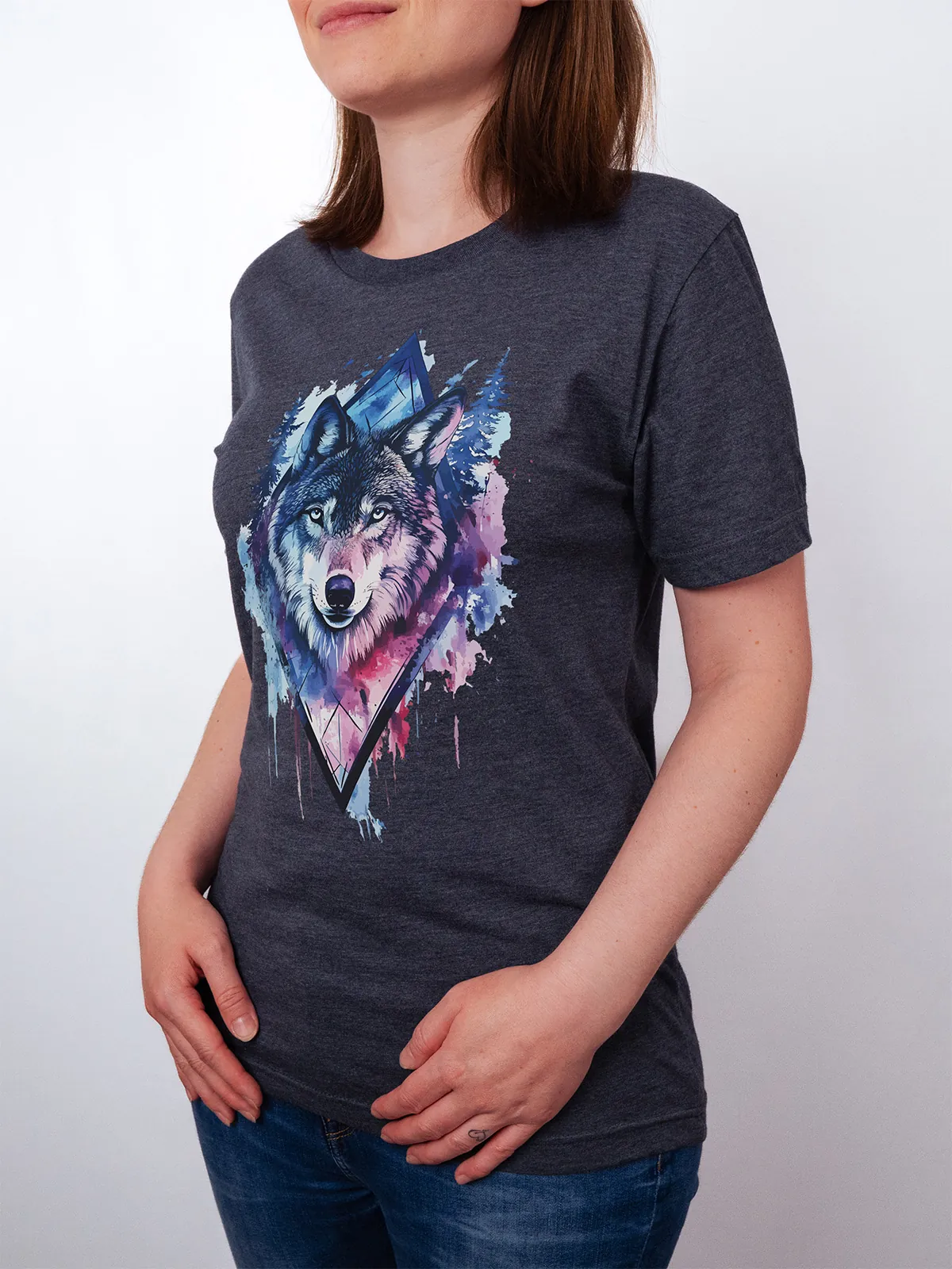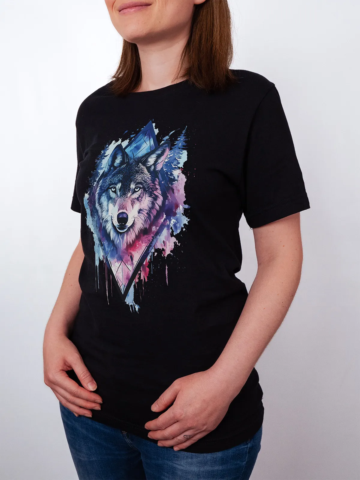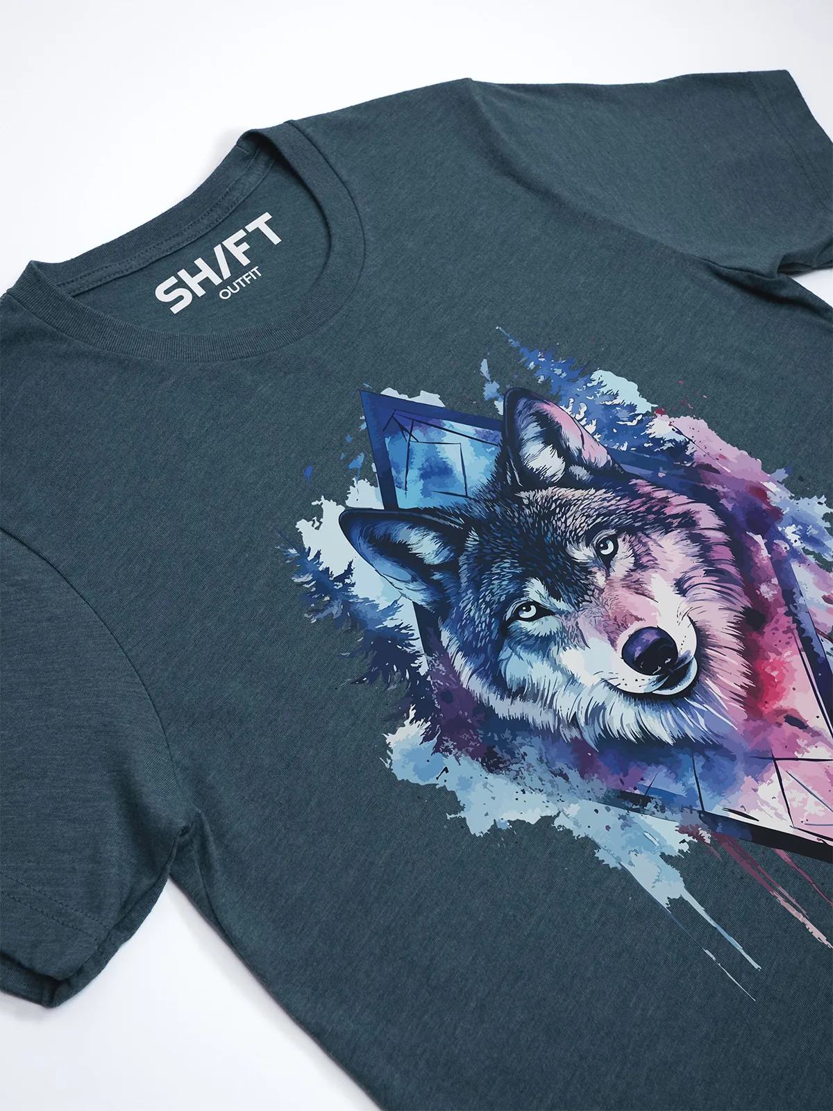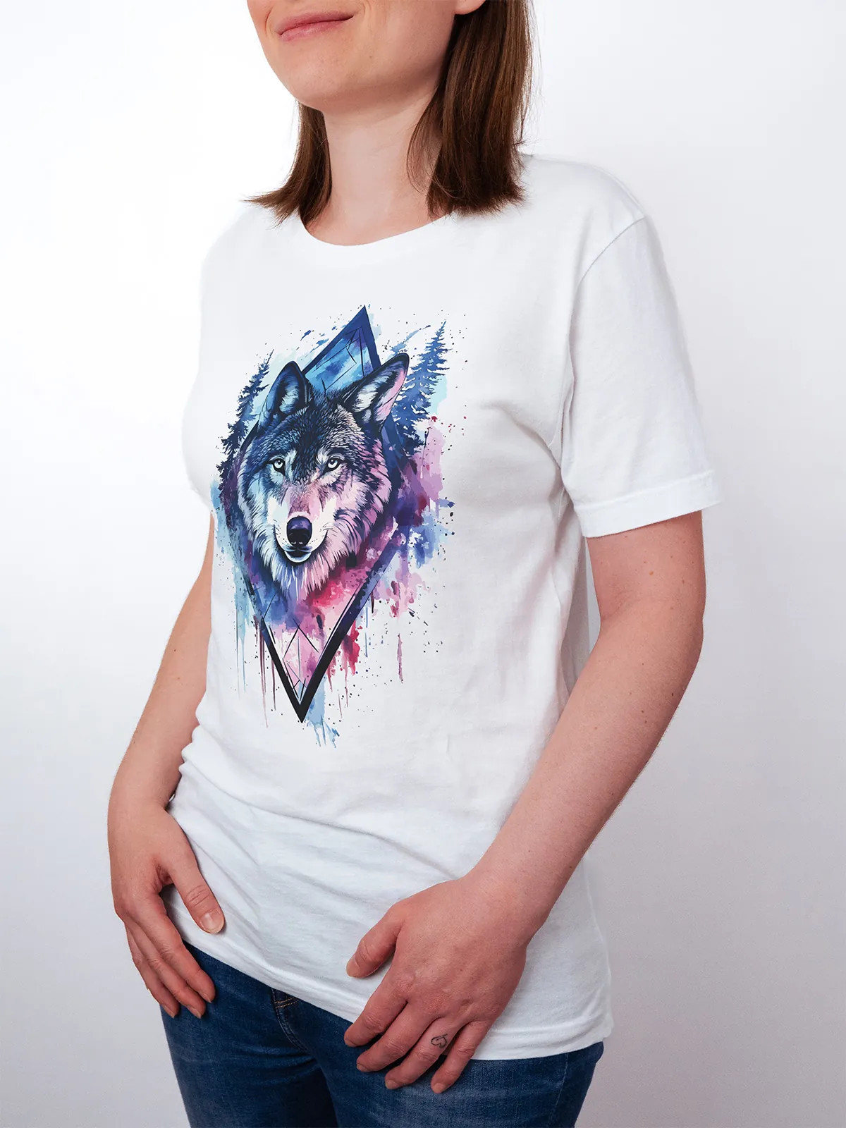 Umfassen Sie Ihre wilde innere Kraft mit einem Design, das einen majestätischen Wolf in leuchtenden Wasserfarben aus Blau und Magenta zeigt, umrahmt von heiliger Geometrie und Waldlandschaft. Dieses T-Shirt zelebriert die spirituelle Verbindung und die rohe Kraft des Wolfsgeistes und ist perfekt für alle, die sich von der Symbolik der Tiere inspirieren lassen und Mut und Intuition verkörpern möchten. Egal, ob Sie spirituell auf der Suche sind oder sich zu lebendigen Ausdrucksformen der Symbolik der Tierwelt hingezogen fühlen, dieses Design bringt transformative Energie und ungezähmte Authentizität in Ihre Garderobe.