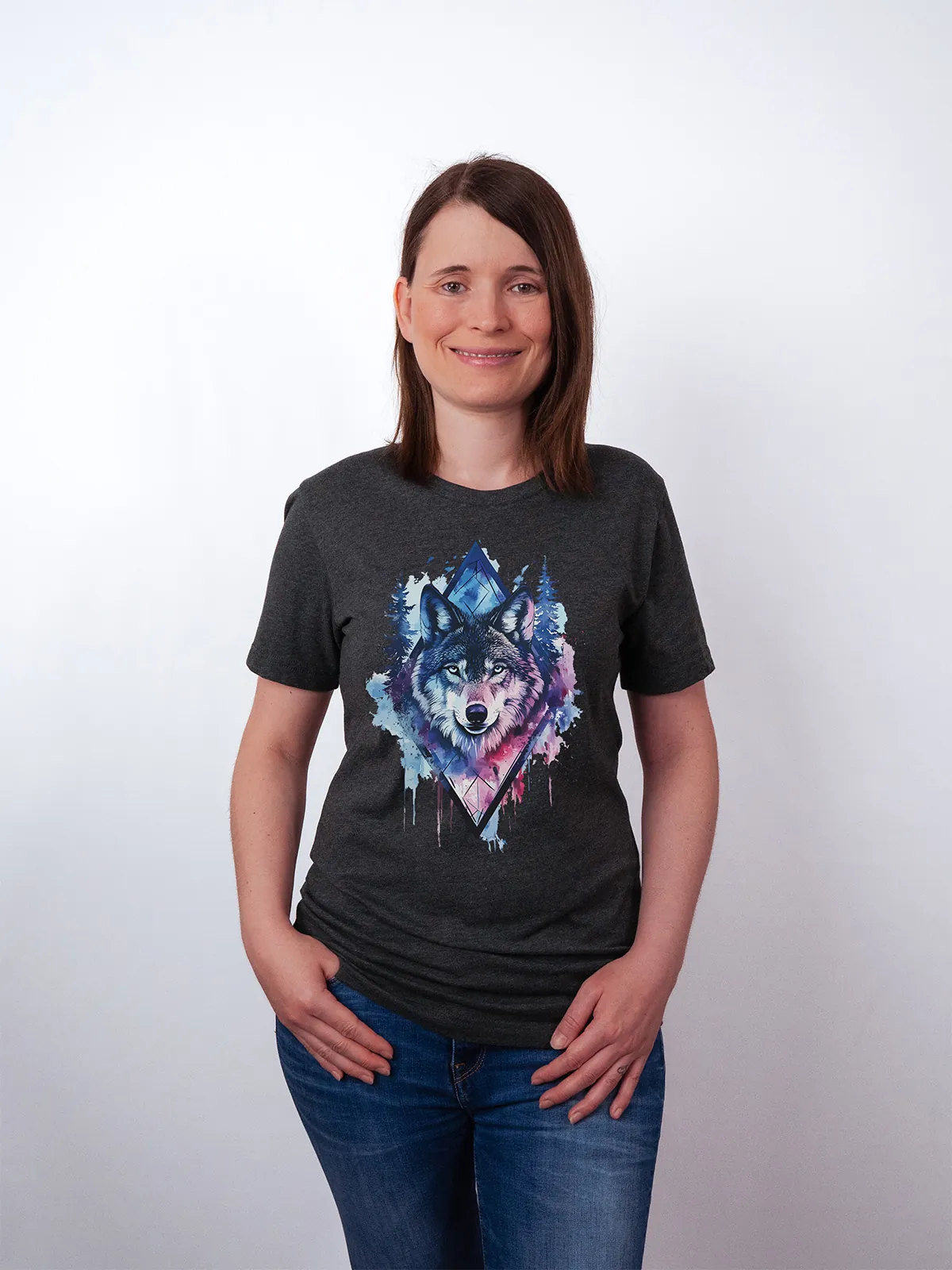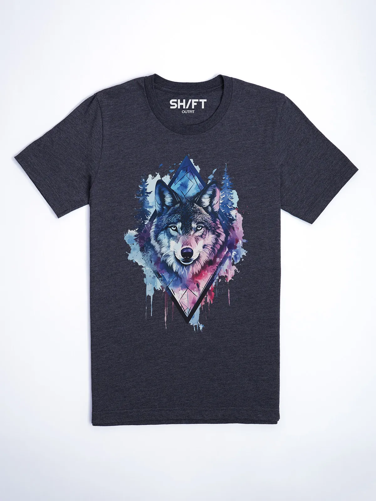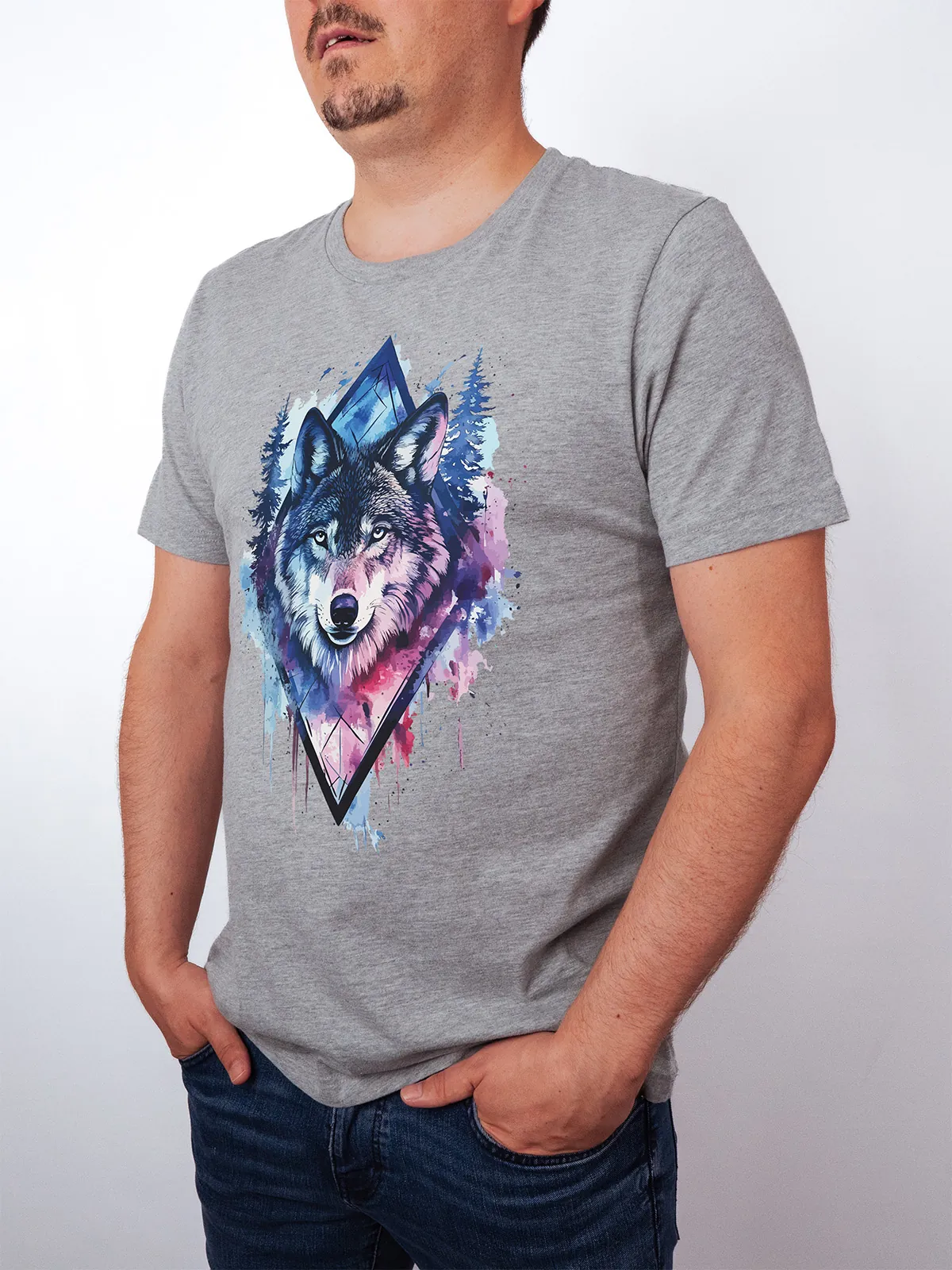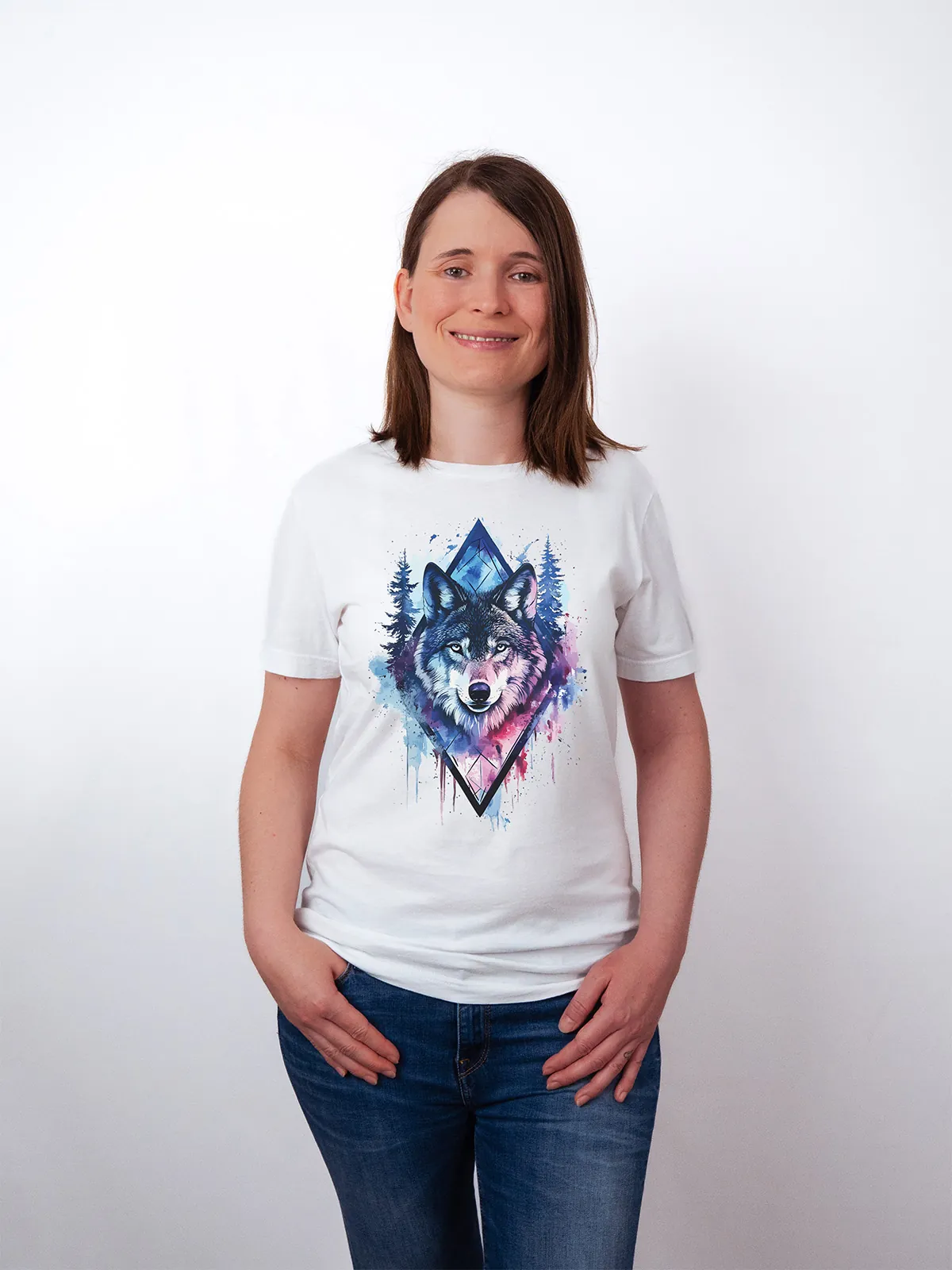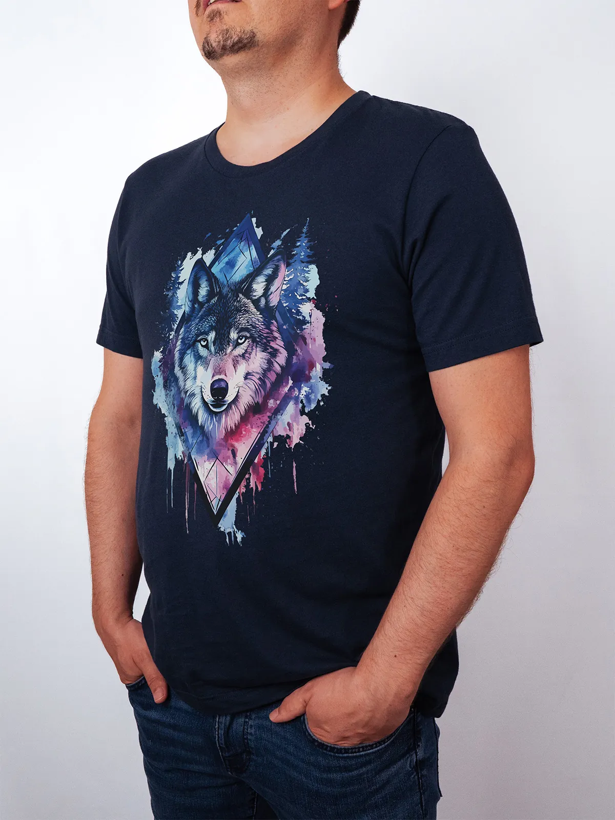 Umfassen Sie Ihre wilde innere Kraft mit einem Design, das einen majestätischen Wolf in leuchtenden Wasserfarben aus Blau und Magenta zeigt, umrahmt von heiliger Geometrie und Waldlandschaft. Dieses T-Shirt zelebriert die spirituelle Verbindung und die rohe Kraft des Wolfsgeistes und ist perfekt für alle, die sich von der Symbolik der Tiere inspirieren lassen und Mut und Intuition verkörpern möchten. Egal, ob Sie spirituell auf der Suche sind oder sich zu lebendigen Ausdrucksformen der Symbolik der Tierwelt hingezogen fühlen, dieses Design bringt transformative Energie und ungezähmte Authentizität in Ihre Garderobe.