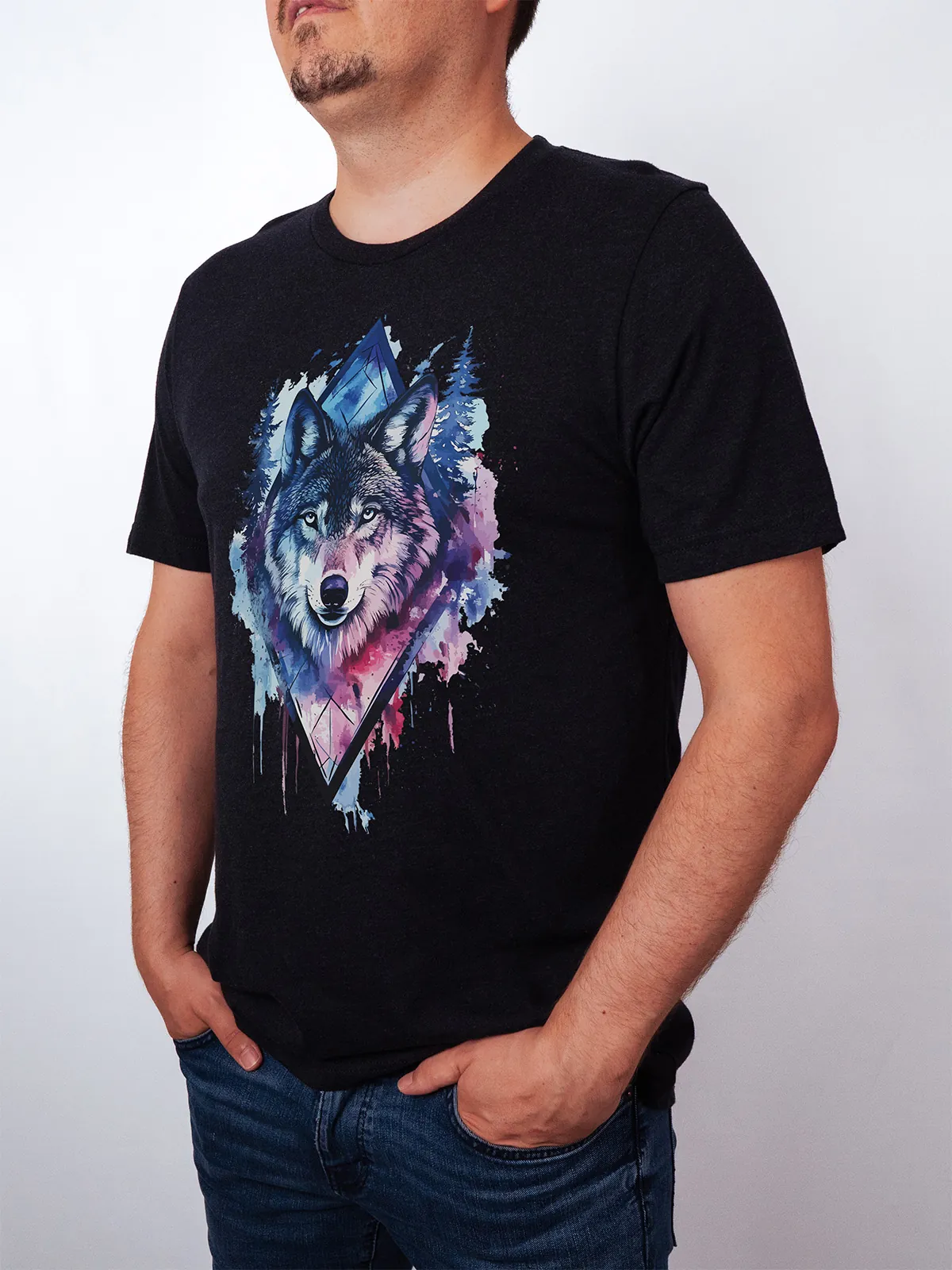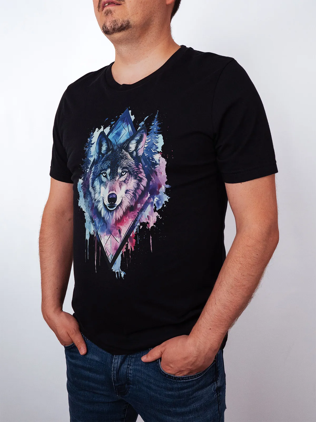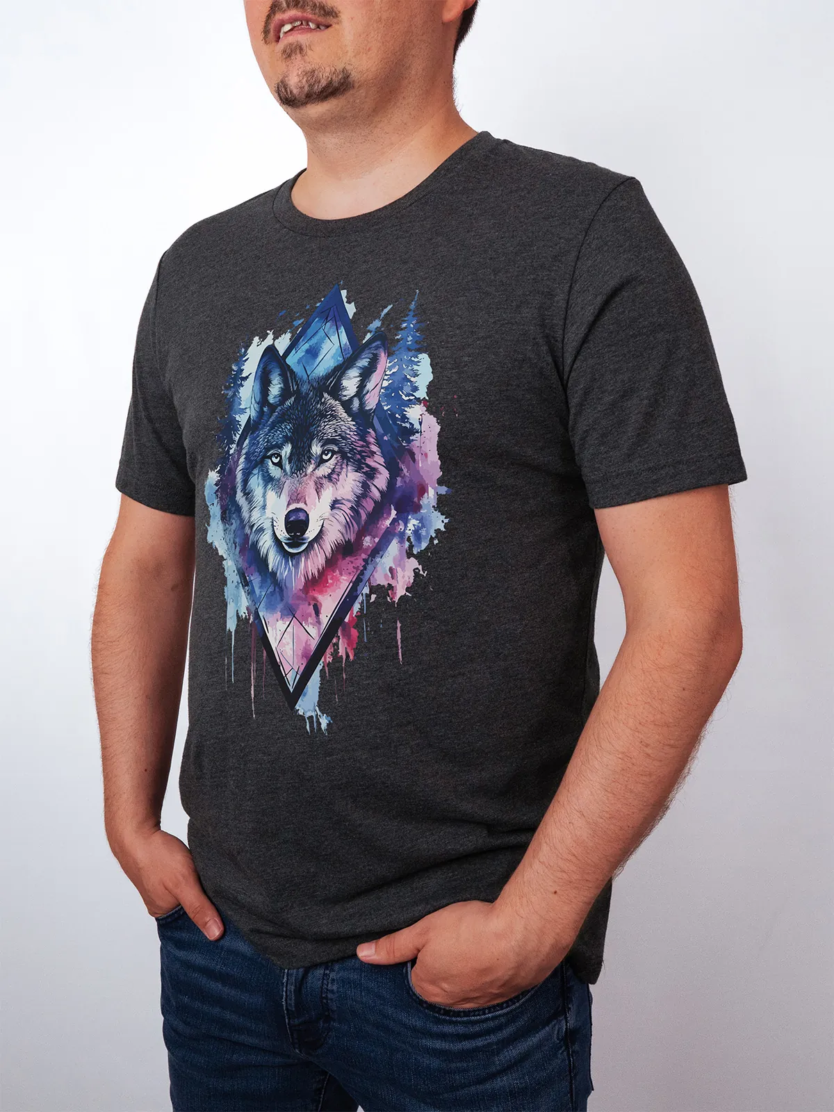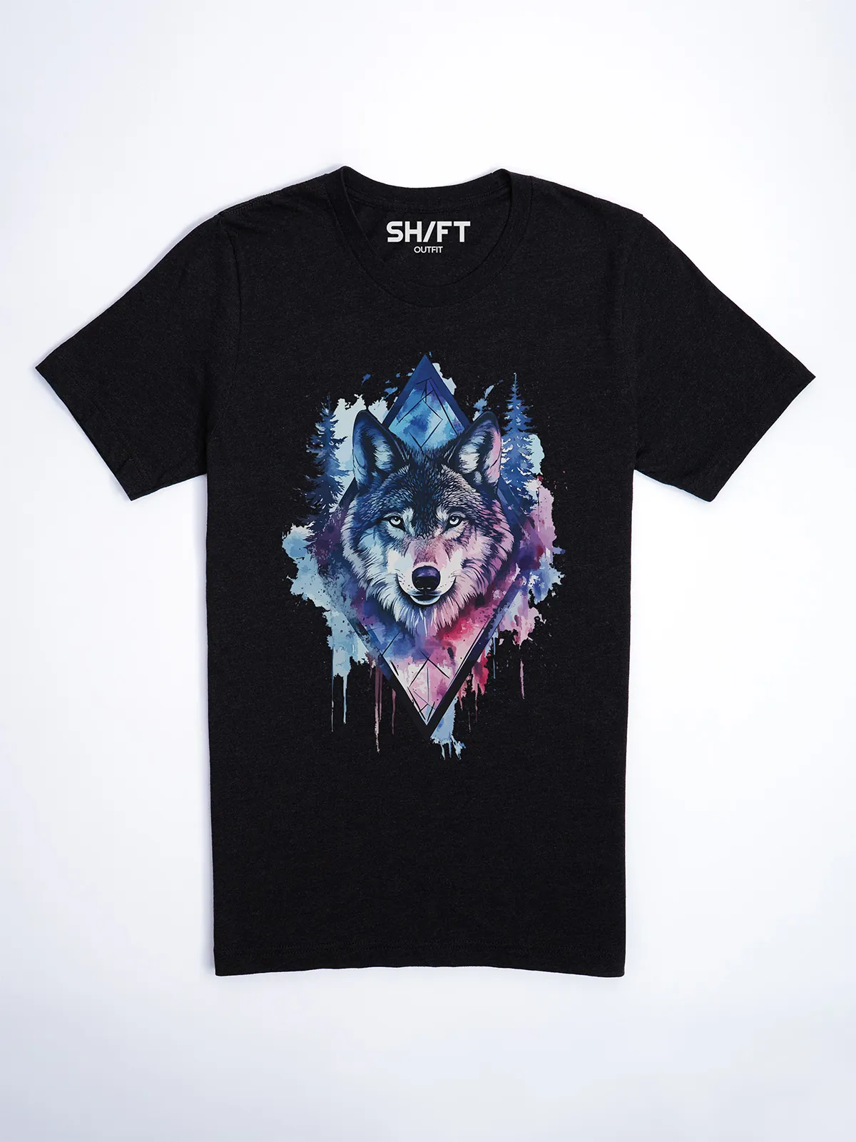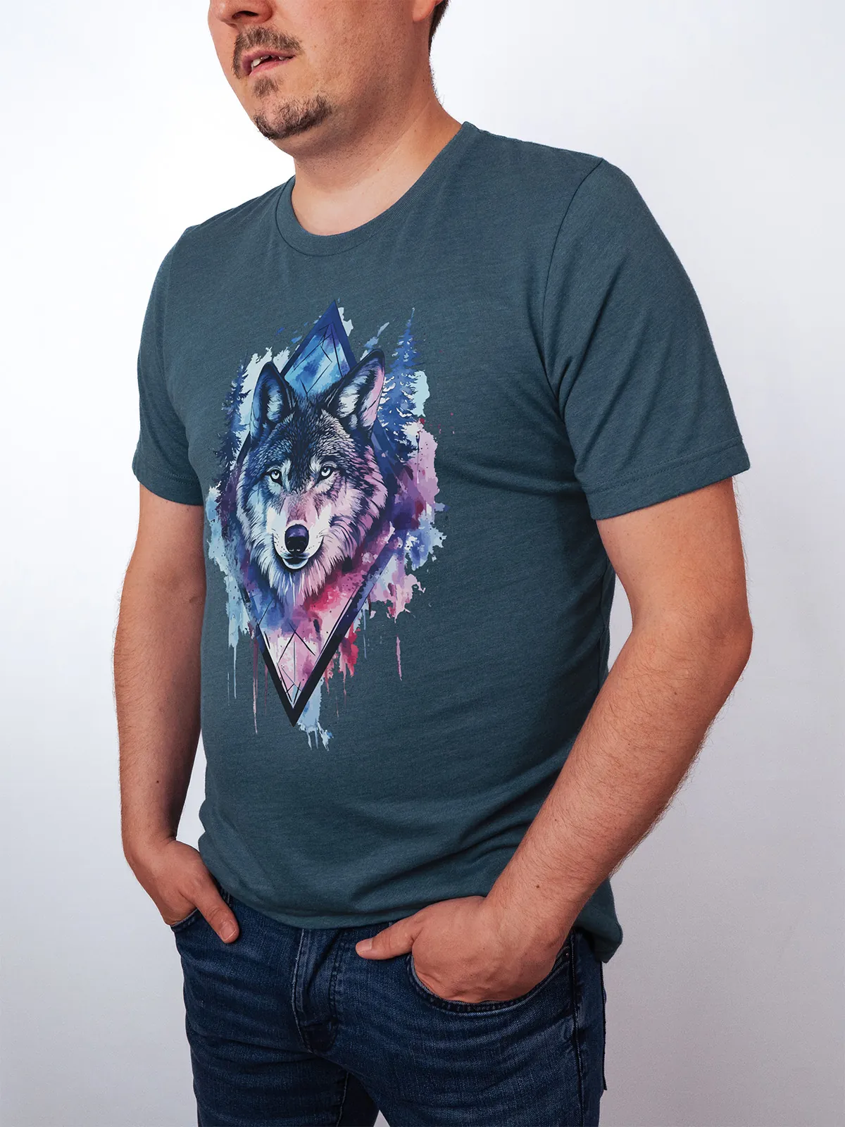 Umfassen Sie Ihre wilde innere Kraft mit einem Design, das einen majestätischen Wolf in leuchtenden Wasserfarben aus Blau und Magenta zeigt, umrahmt von heiliger Geometrie und Waldlandschaft. Dieses T-Shirt zelebriert die spirituelle Verbindung und die rohe Kraft des Wolfsgeistes und ist perfekt für alle, die sich von der Symbolik der Tiere inspirieren lassen und Mut und Intuition verkörpern möchten. Egal, ob Sie spirituell auf der Suche sind oder sich zu lebendigen Ausdrucksformen der Symbolik der Tierwelt hingezogen fühlen, dieses Design bringt transformative Energie und ungezähmte Authentizität in Ihre Garderobe.