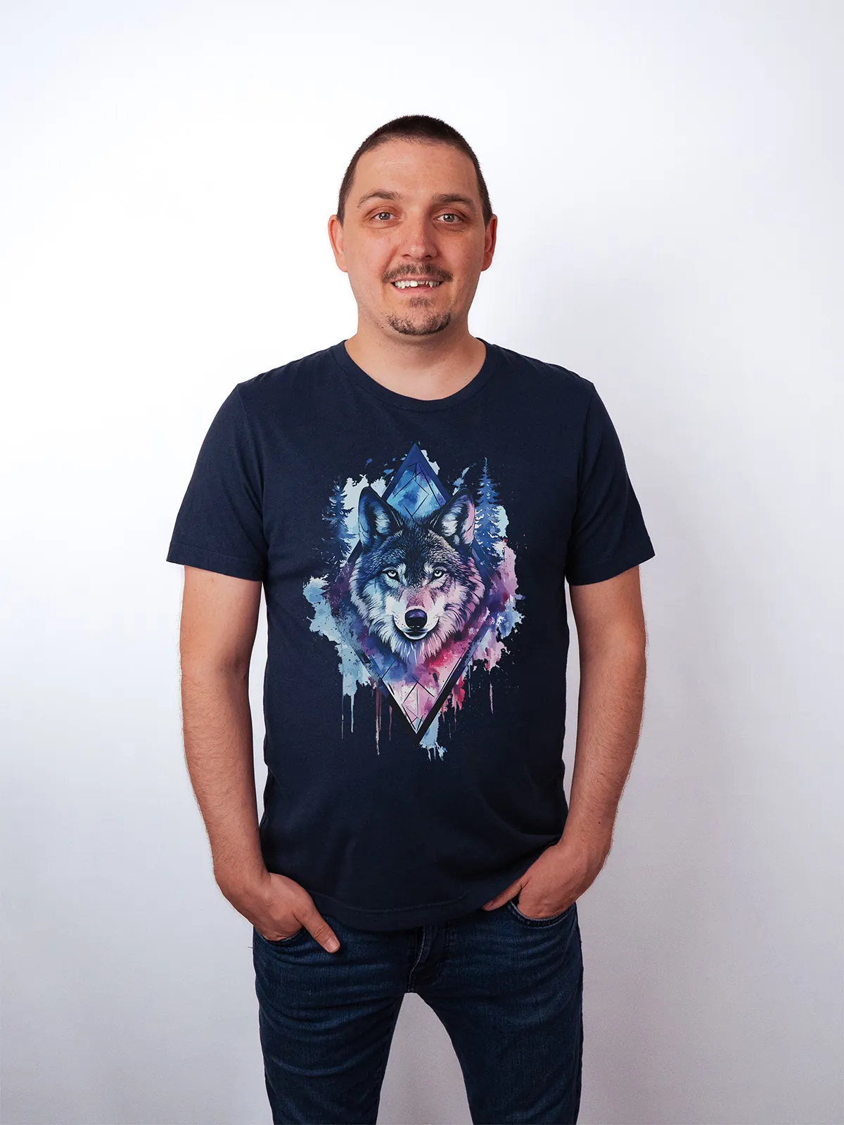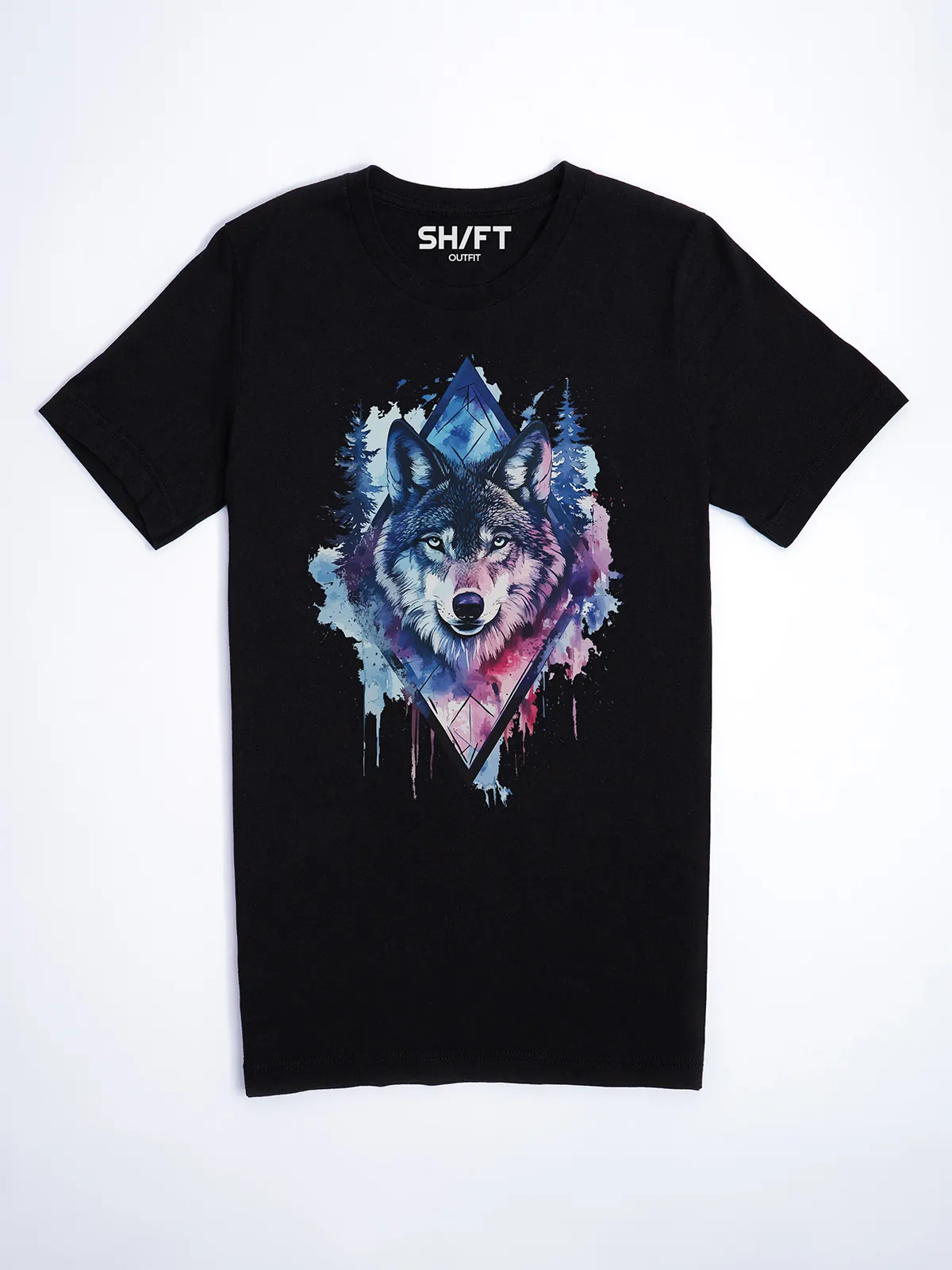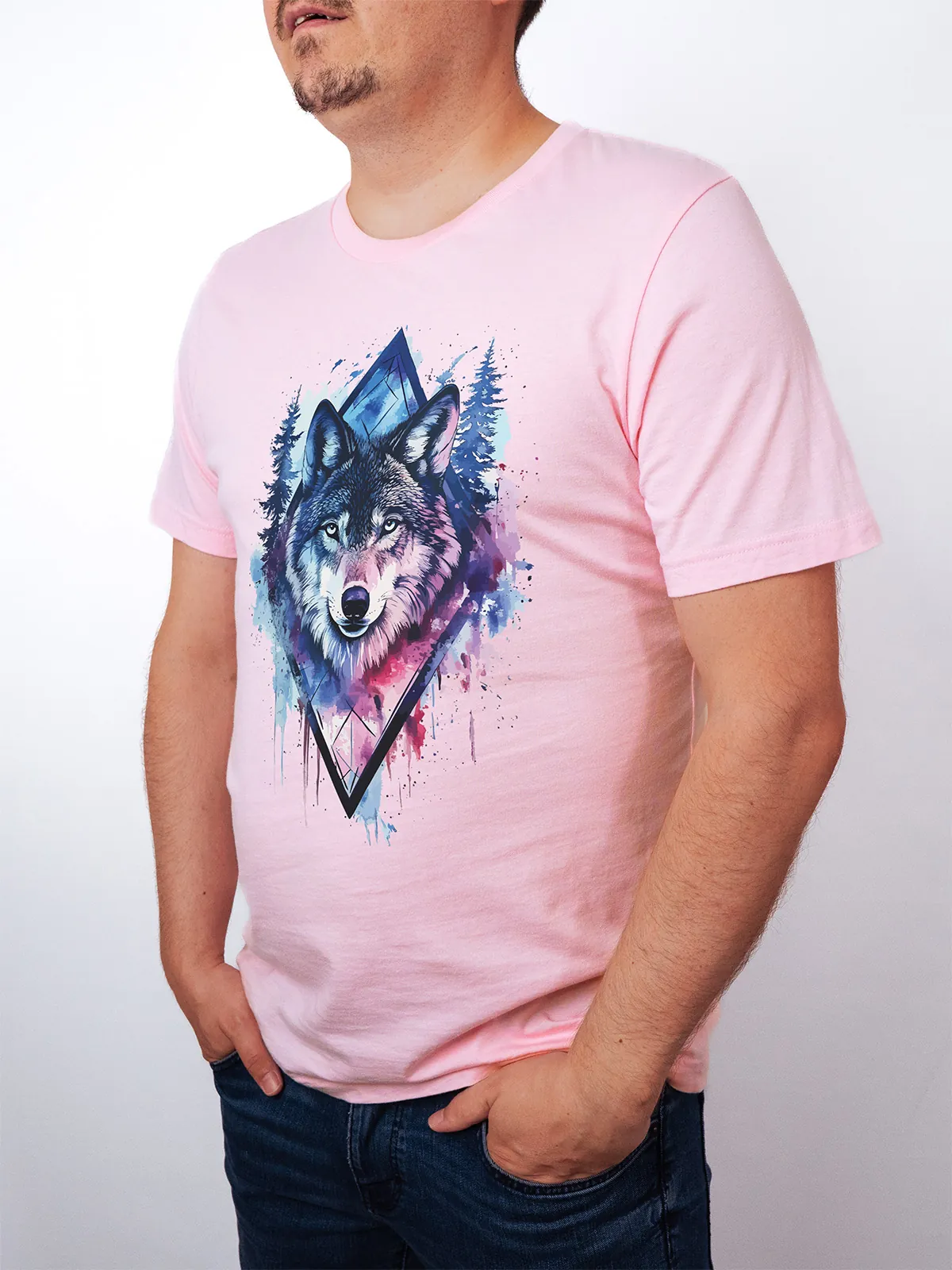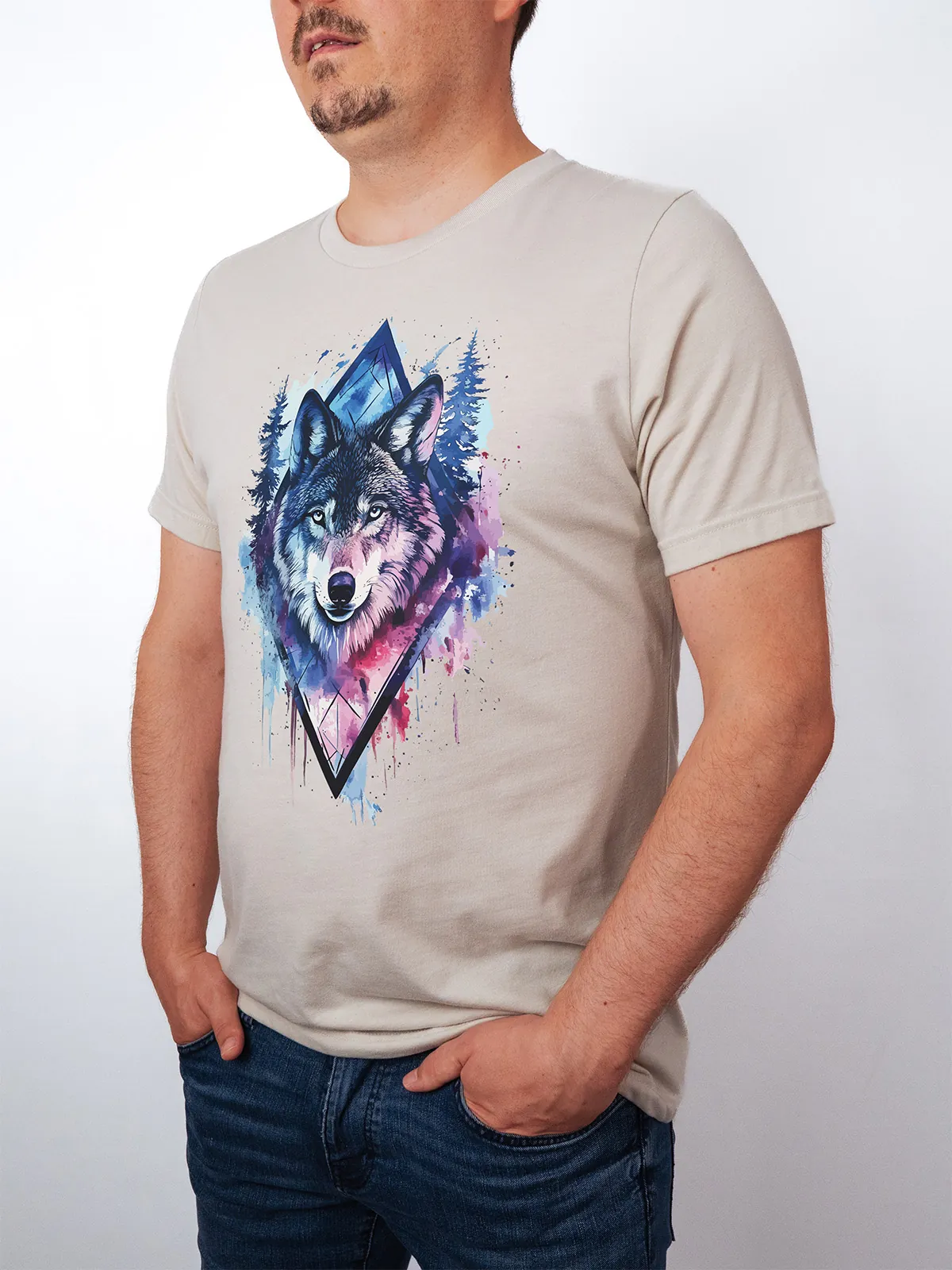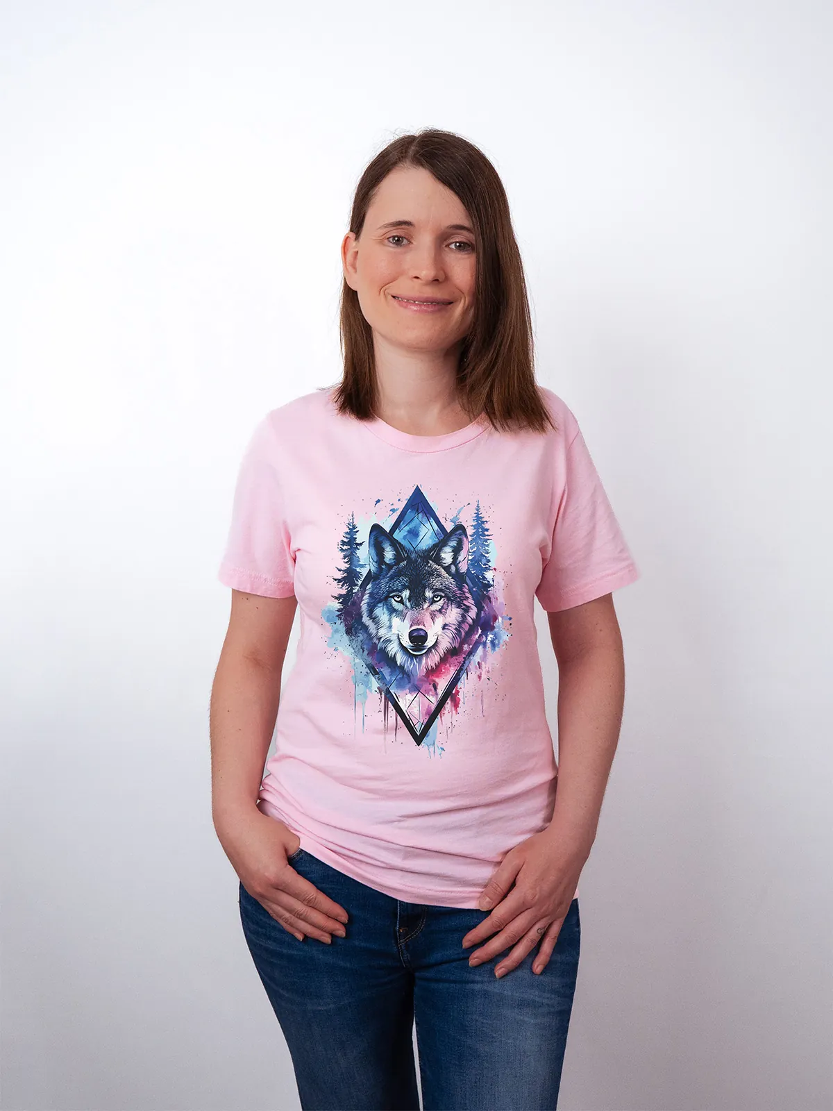 Umfassen Sie Ihre wilde innere Kraft mit einem Design, das einen majestätischen Wolf in leuchtenden Wasserfarben aus Blau und Magenta zeigt, umrahmt von heiliger Geometrie und Waldlandschaft. Dieses T-Shirt zelebriert die spirituelle Verbindung und die rohe Kraft des Wolfsgeistes und ist perfekt für alle, die sich von der Symbolik der Tiere inspirieren lassen und Mut und Intuition verkörpern möchten. Egal, ob Sie spirituell auf der Suche sind oder sich zu lebendigen Ausdrucksformen der Symbolik der Tierwelt hingezogen fühlen, dieses Design bringt transformative Energie und ungezähmte Authentizität in Ihre Garderobe.