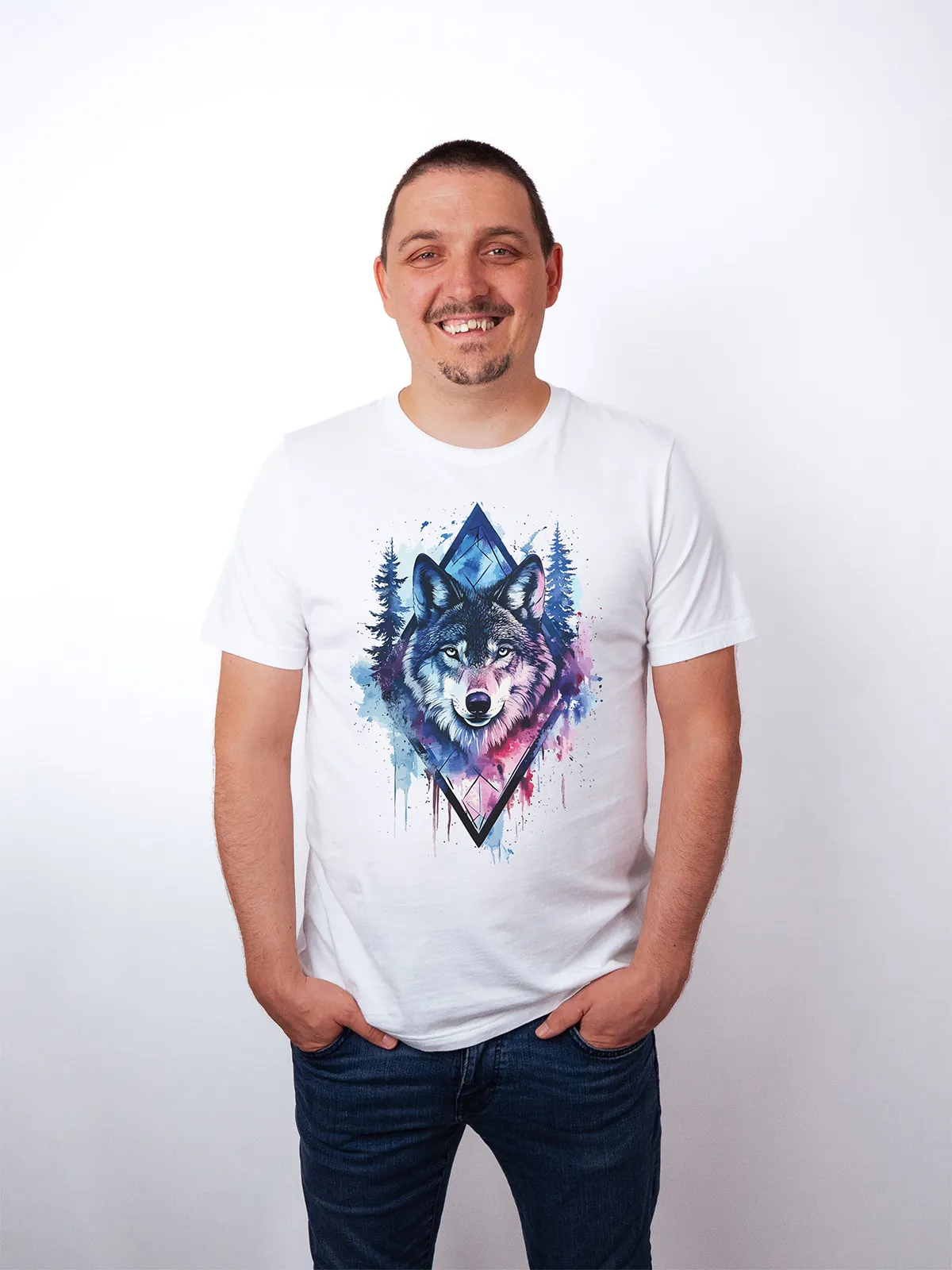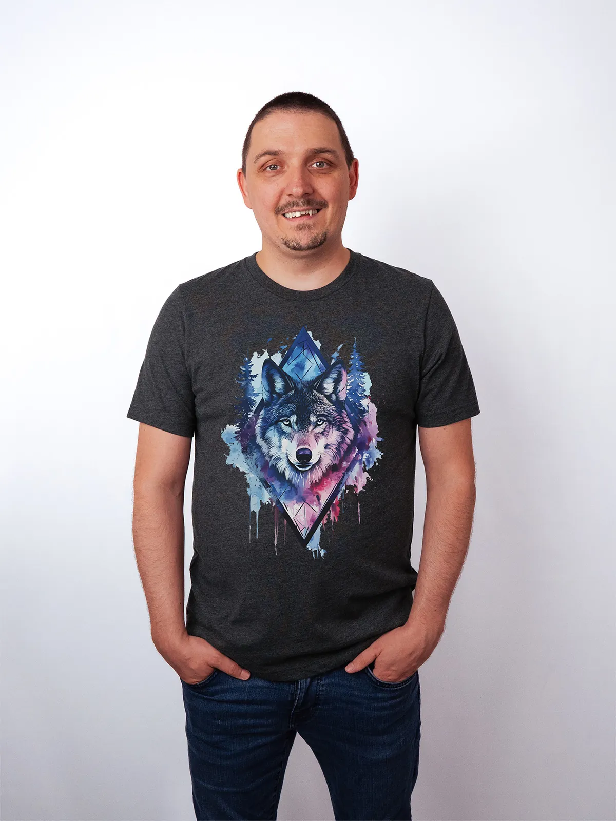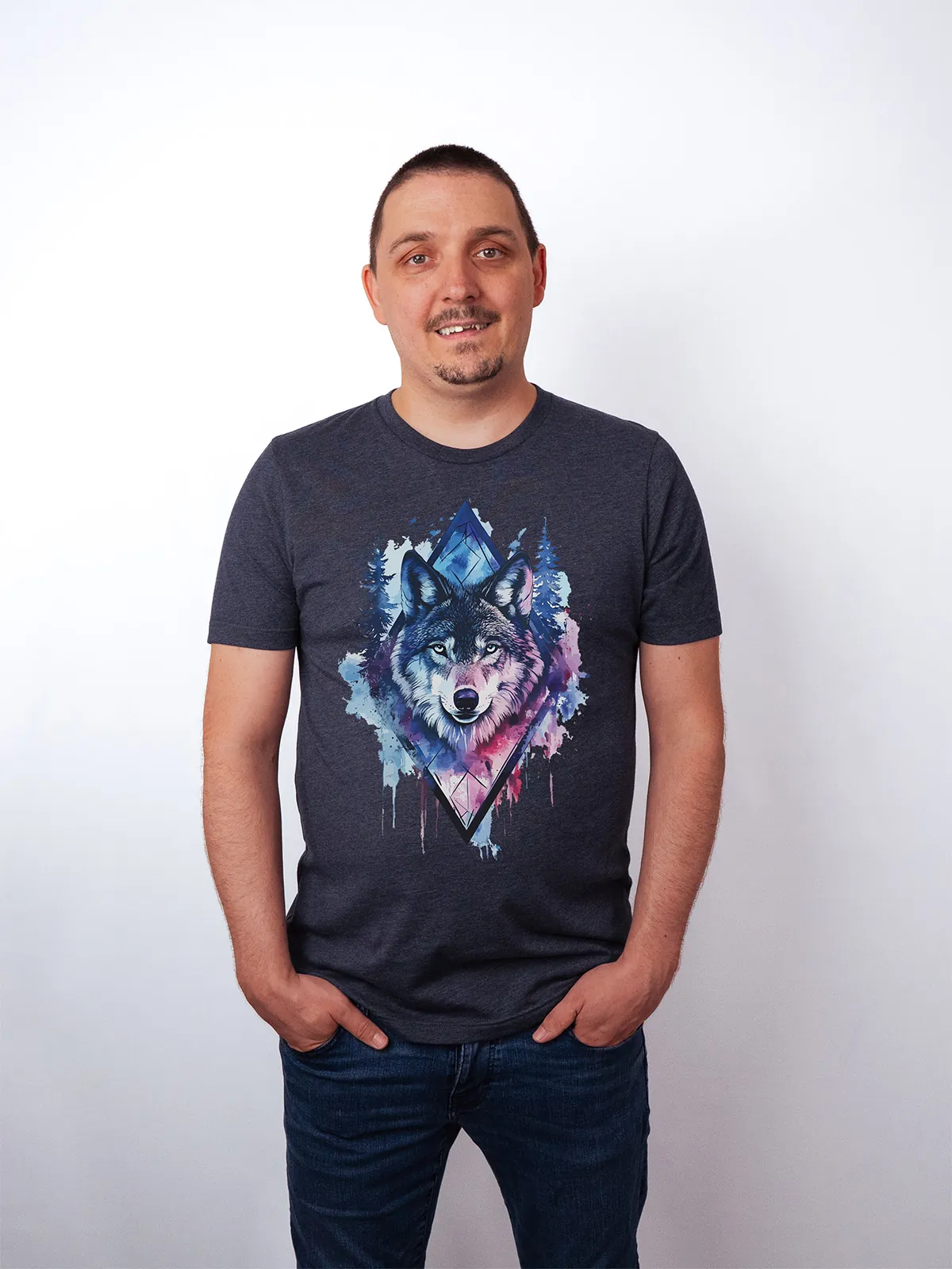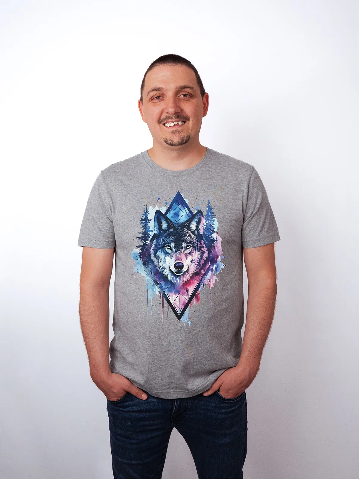 Umfassen Sie Ihre wilde innere Kraft mit einem Design, das einen majestätischen Wolf in leuchtenden Wasserfarben aus Blau und Magenta zeigt, umrahmt von heiliger Geometrie und Waldlandschaft. Dieses T-Shirt zelebriert die spirituelle Verbindung und die rohe Kraft des Wolfsgeistes und ist perfekt für alle, die sich von der Symbolik der Tiere inspirieren lassen und Mut und Intuition verkörpern möchten. Egal, ob Sie spirituell auf der Suche sind oder sich zu lebendigen Ausdrucksformen der Symbolik der Tierwelt hingezogen fühlen, dieses Design bringt transformative Energie und ungezähmte Authentizität in Ihre Garderobe.