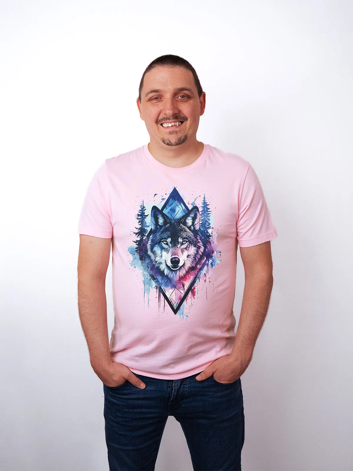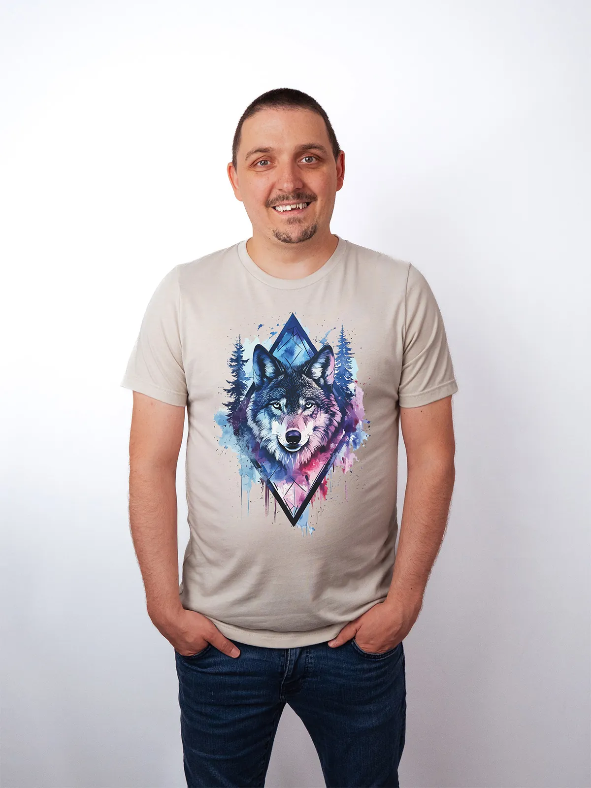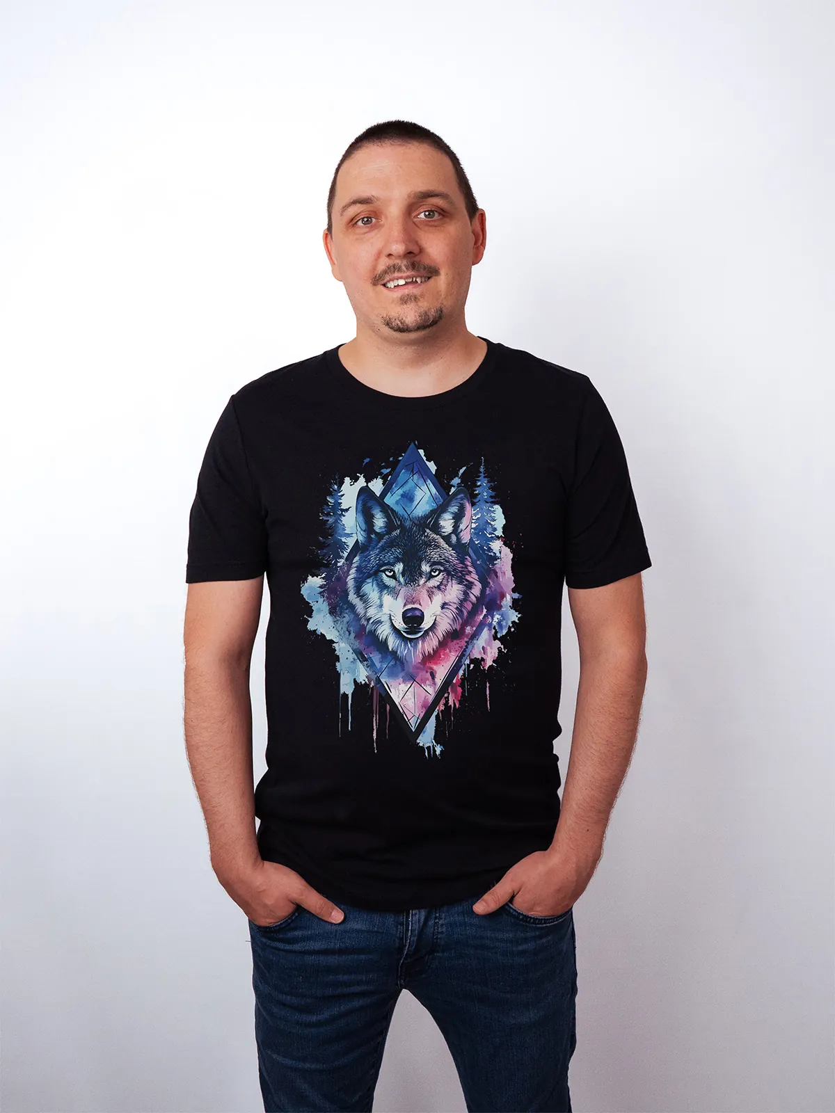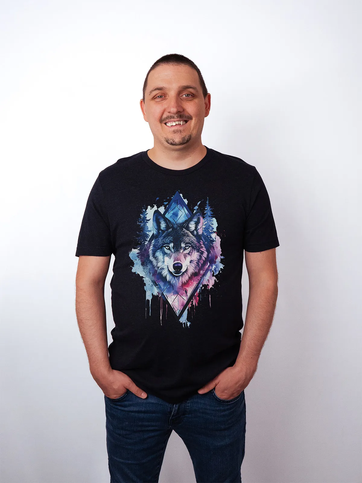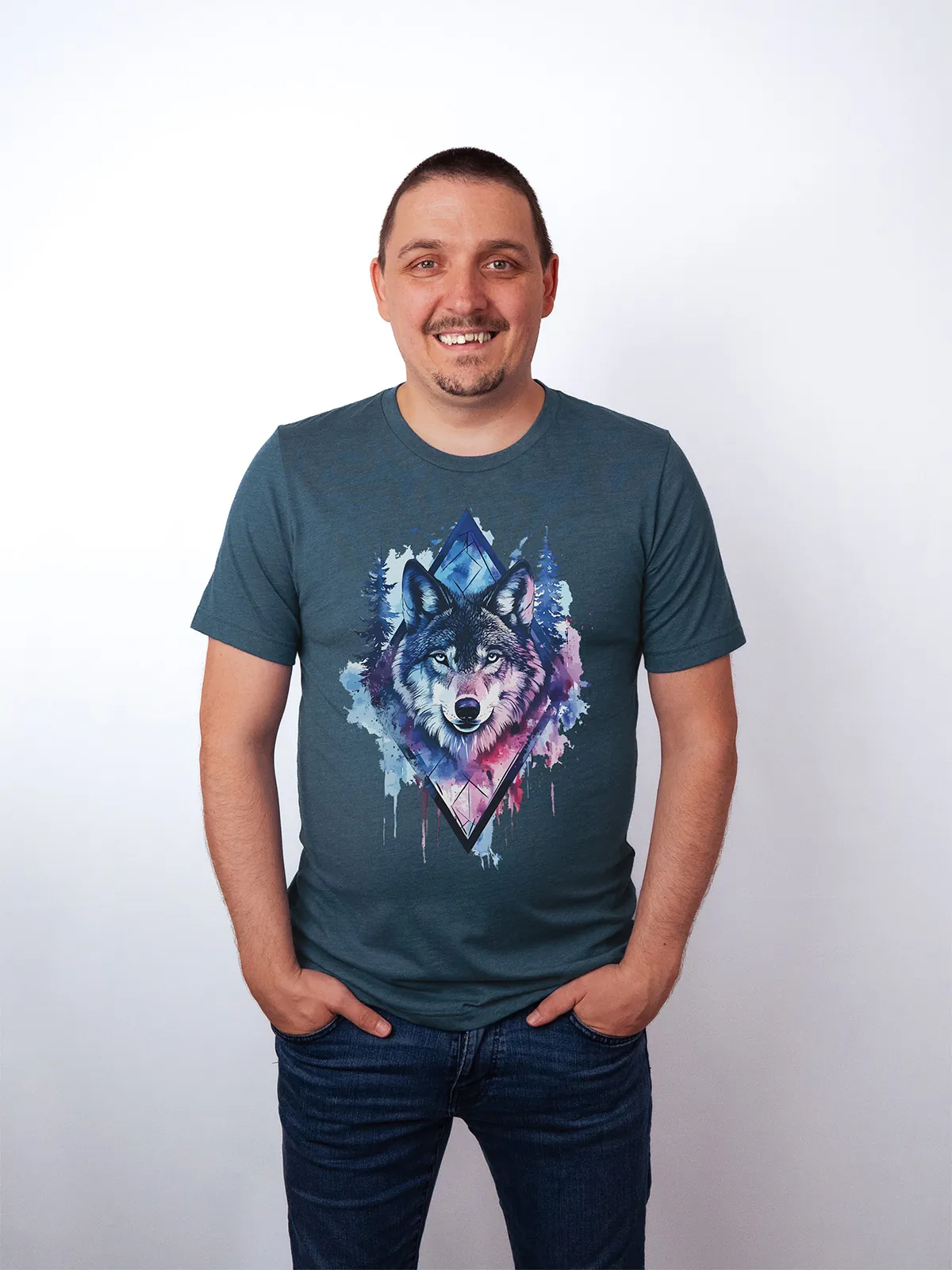 Umfassen Sie Ihre wilde innere Kraft mit einem Design, das einen majestätischen Wolf in leuchtenden Wasserfarben aus Blau und Magenta zeigt, umrahmt von heiliger Geometrie und Waldlandschaft. Dieses T-Shirt zelebriert die spirituelle Verbindung und die rohe Kraft des Wolfsgeistes und ist perfekt für alle, die sich von der Symbolik der Tiere inspirieren lassen und Mut und Intuition verkörpern möchten. Egal, ob Sie spirituell auf der Suche sind oder sich zu lebendigen Ausdrucksformen der Symbolik der Tierwelt hingezogen fühlen, dieses Design bringt transformative Energie und ungezähmte Authentizität in Ihre Garderobe.